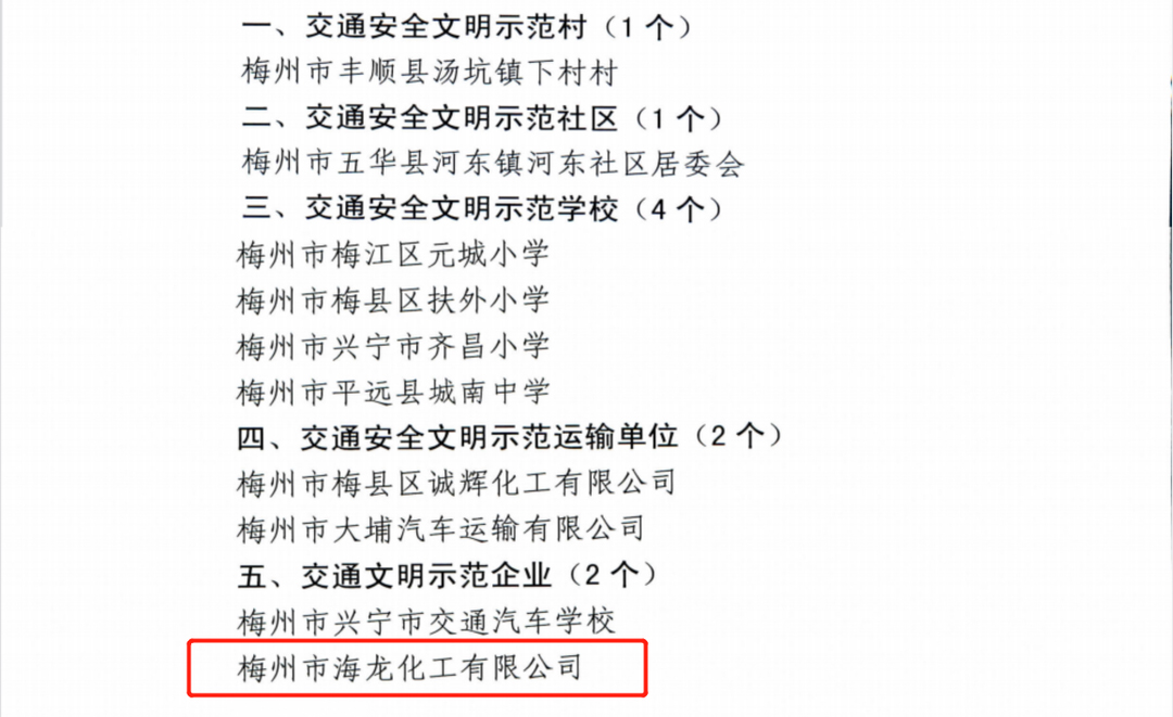 海龍化工積極響應交通安全文明要求,自公司成立以來,深耕文明交通行動領域,致力于建設安全文明、和諧有序的道路交通環(huán)境工作,為營造文明和諧的城市環(huán)境貢獻力量。公司始終貫徹“安全第一,預防為主”的安全工作方針,注重交通安全文明建設,通過加強教育、健全制度,強化監(jiān)督等措施,把交通安全作為公司安全生產(chǎn)中重要的一環(huán),認真貫徹落實,嚴格遵守交通法律法規(guī),實現(xiàn)了自公司成立以來無重大交通事故發(fā)生、無人員人身傷亡的目標,確保了生產(chǎn)經(jīng)營的正常運轉。