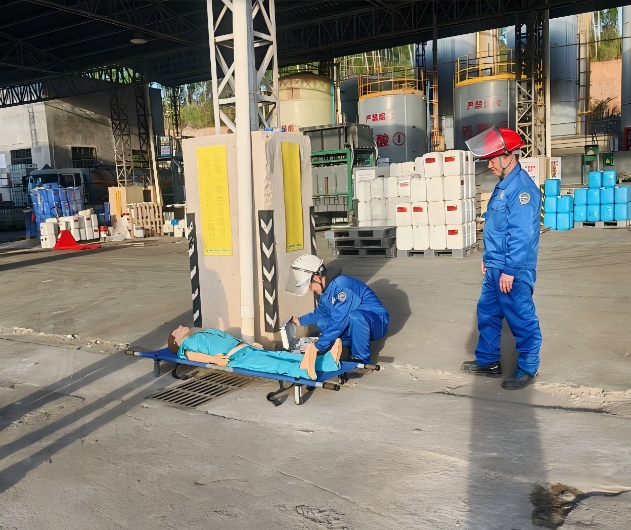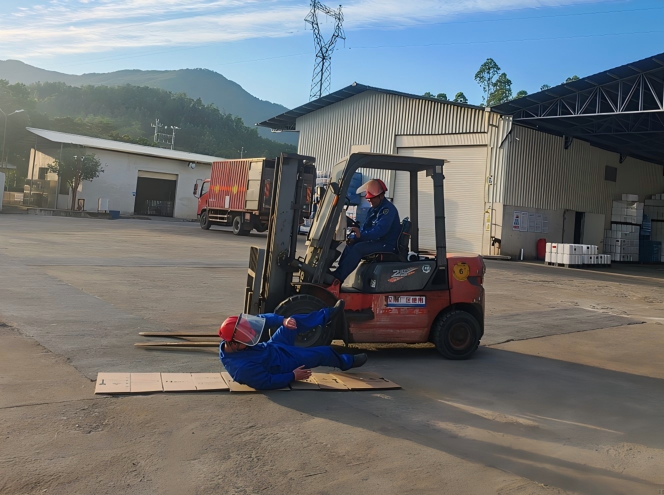 模擬三酸車間叉車駕駛員操作叉車運(yùn)作貨物時(shí),因滿載貨物視線不良,未注意好前方情況,與正在盤點(diǎn)貨物的倉管員發(fā)生碰撞。