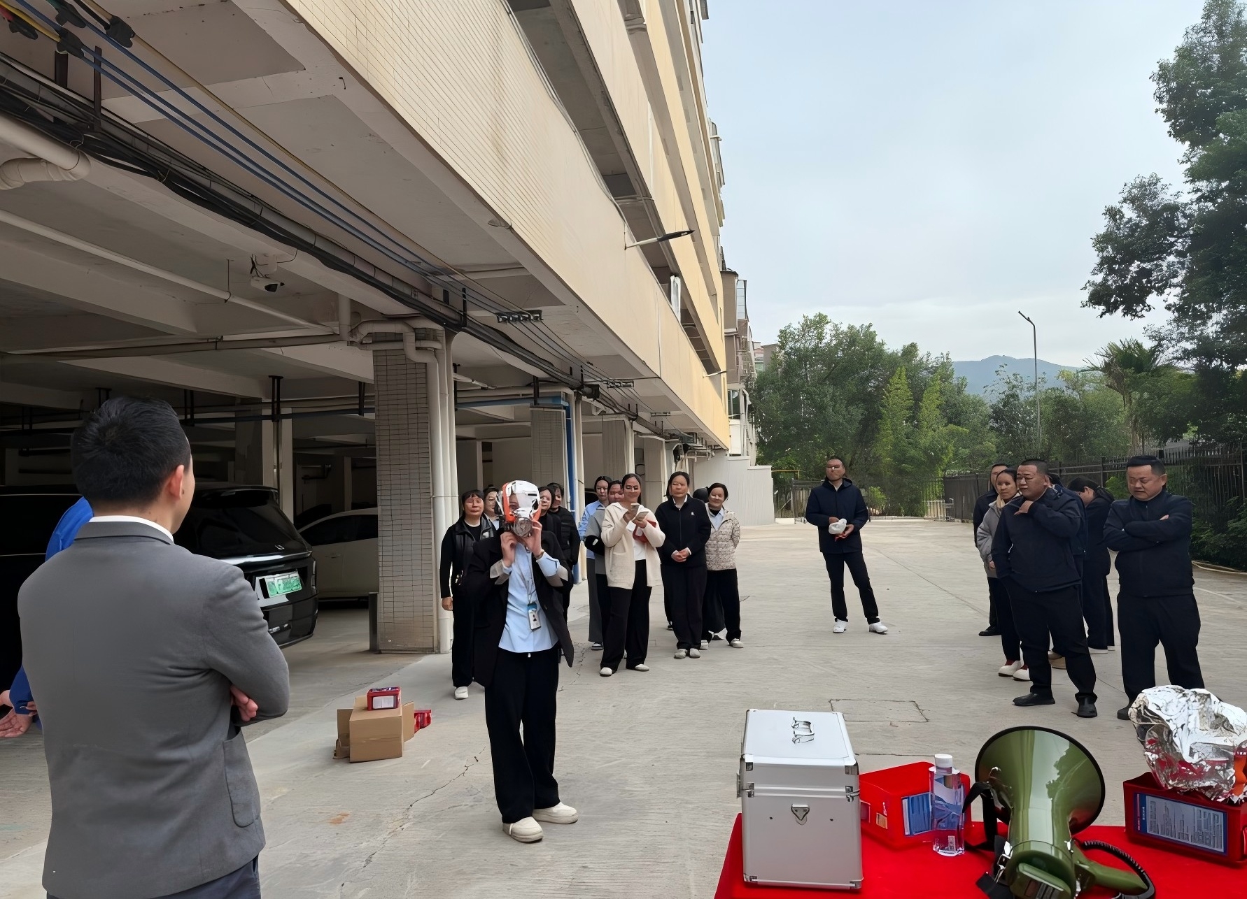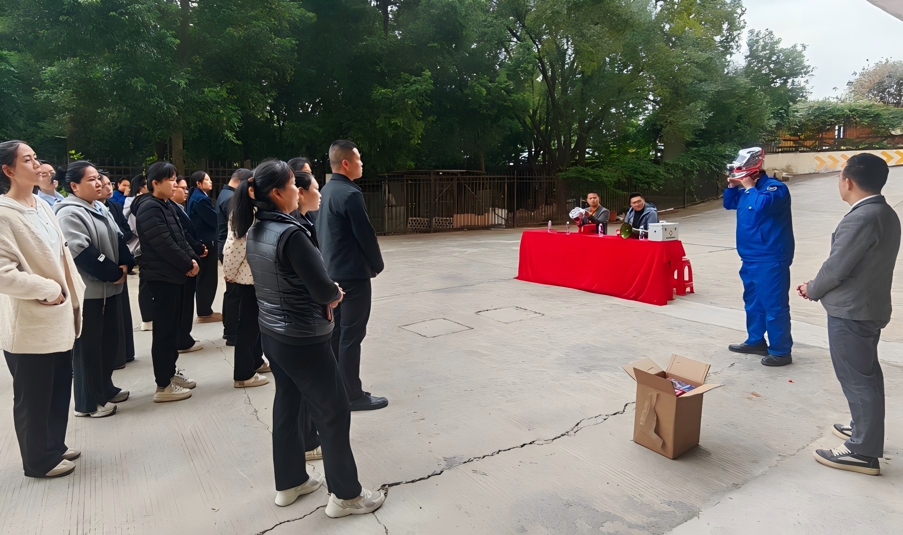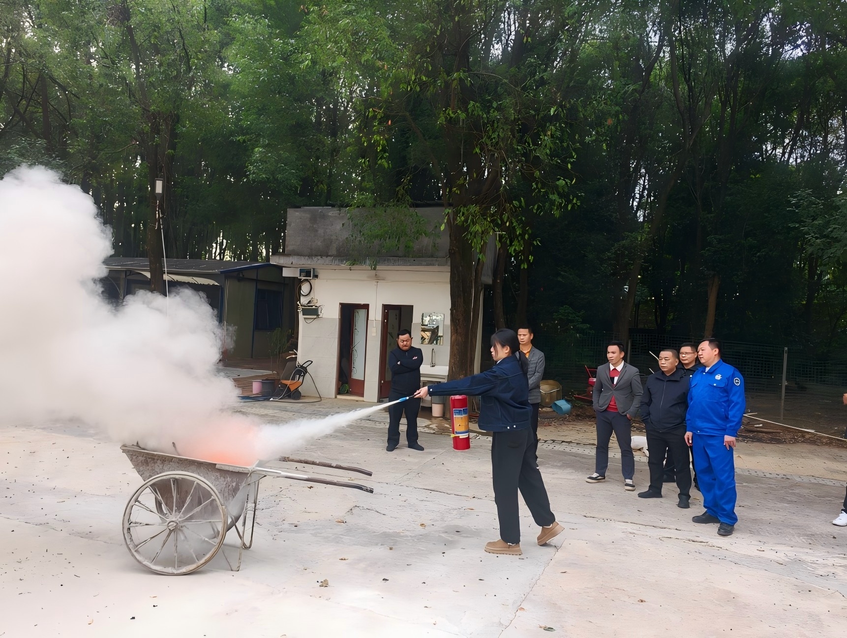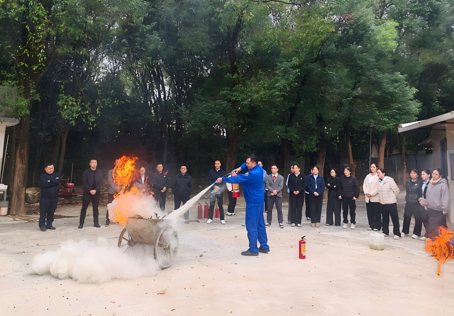 由指導(dǎo)員向大家講解使用滅火器及面罩的方法及注意事項(xiàng),并安排每人依次進(jìn)行滅火器滅火操作。